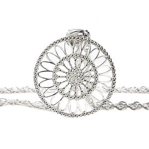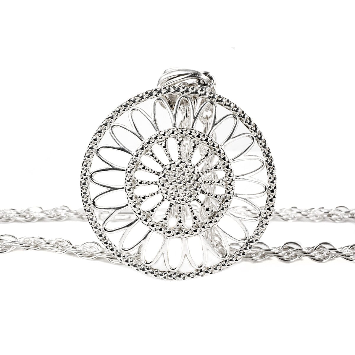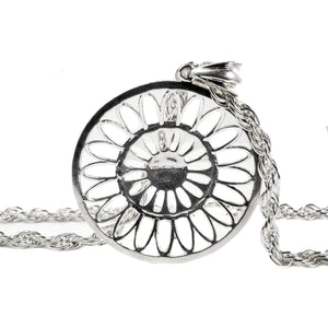 This Silver Flower Necklace is ready to wear (or gift) featuring both the chain and the pendant. This is a great, bohemian piece featuring a large and focal flower pendant. The pendant is reminiscent of a sunflower and it will be a lovely piece for the fall season.