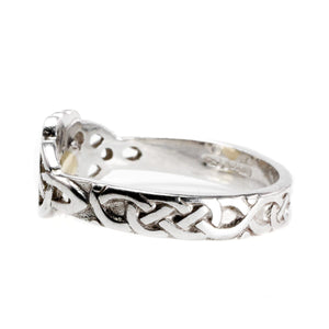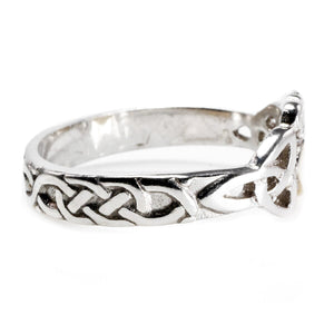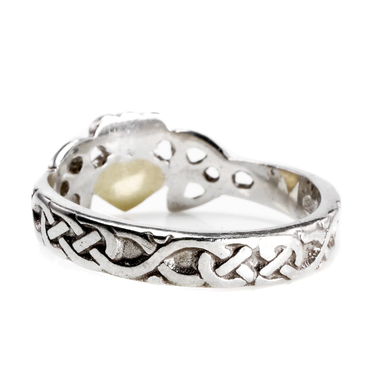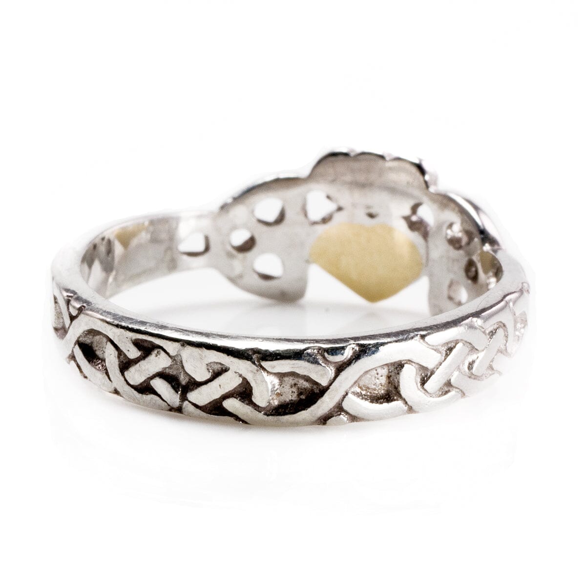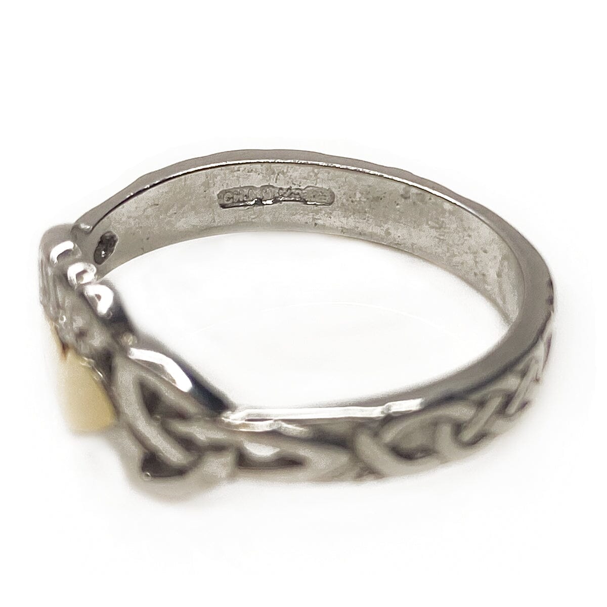 The ring is a size 8 and measures 8.8 mm or 0.3 inches in height as it sits on the finger. The width of the ring at the very back of the band is 4 mm in height and the Celtic knot does continue the full way around the ring. The gold heart detail measures 4 mm in height by 7 mm in width and the ring weighs 2.9 grams.