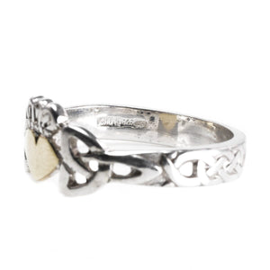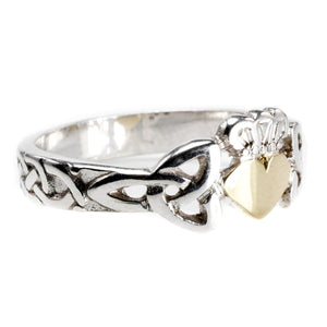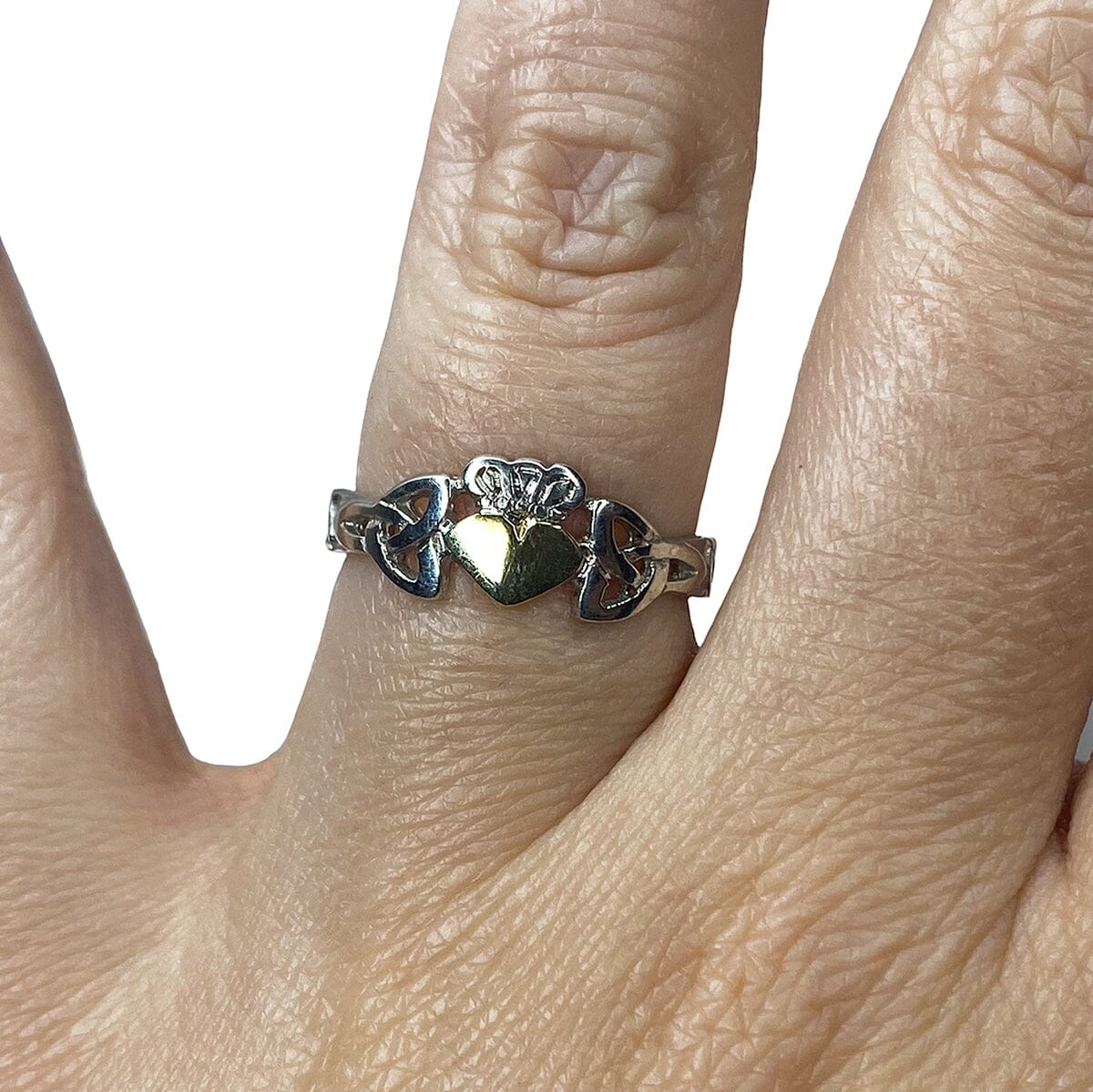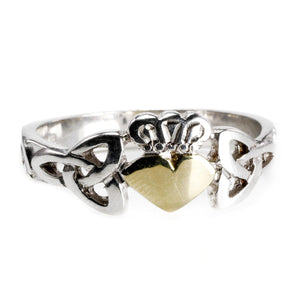 This Silver & Gold Plated Celtic Heart Ring is so pretty! It's a little reminiscent of a traditional Irish Claddagh however the hand details that usual frame the heart motif, have been replaced with Celtic trefoil knot. This knot represents unity, protection and everlasting life and it's a never ending knot. The gold heart at the center of this ring is gold plated but unlike a lot of gold plating which is a very bright yellow, this is subtle and more closely resembles solid gold. It's just an exceptionally pretty, heartfelt, romantic ring ideal for everyday wear.