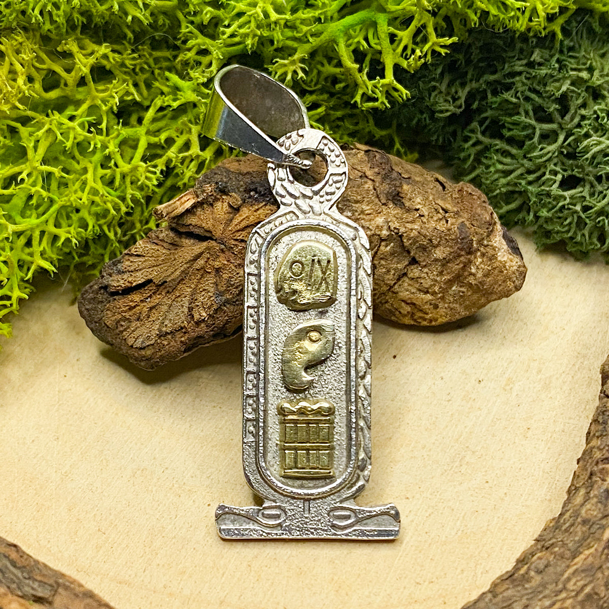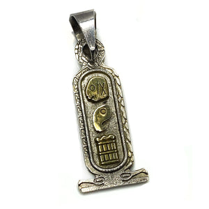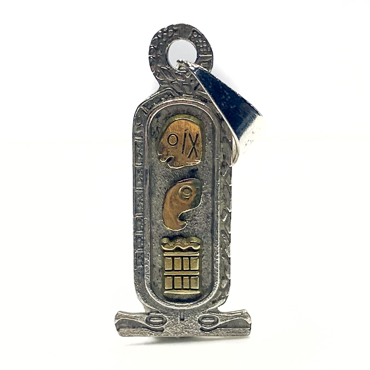 This Silver Hieroglyphics Pendant features brass accents to create this lovely contrast. The pendant features what appears to be eagle heads on the base with three brass hieroglyphics detailed directly above. The edge of the pendant is lightly textured.