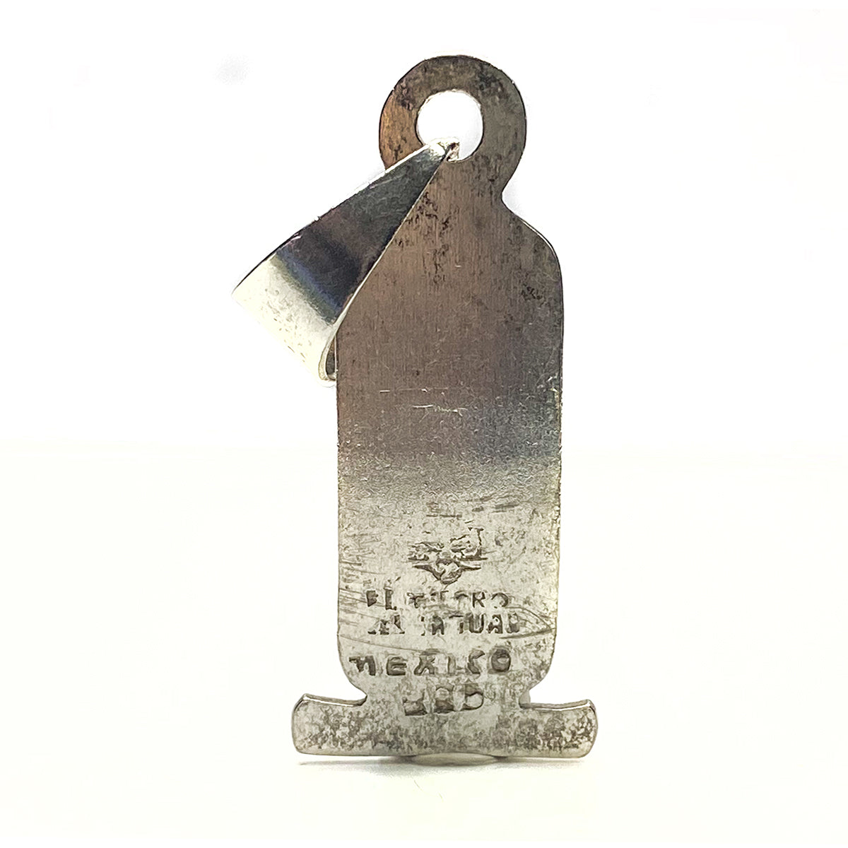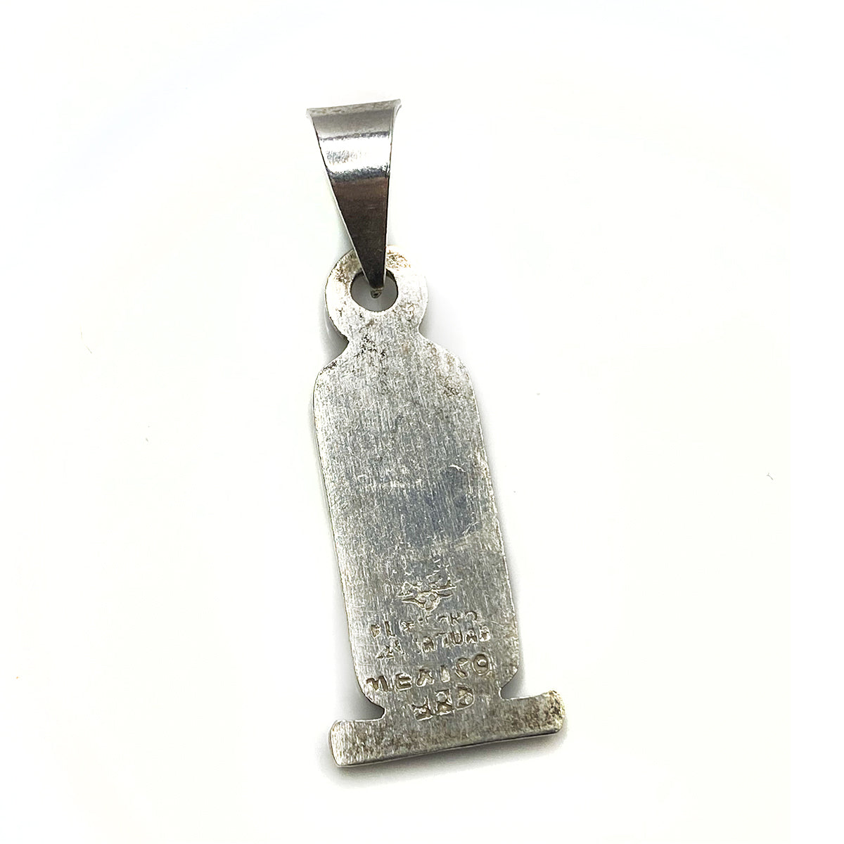 The pendant measures 4.5 cm (or 1.7 inches) in height, including it's hanger. Excluding the hanger, the pendant measures 3.5 cm (or 1.4 inches) in height. It measures 16 mm or 0.6 inches at it's widest point across the base. The pendant weighs 5.8 grams. It is hallmarked on the back, with the country of production; Mexico.
