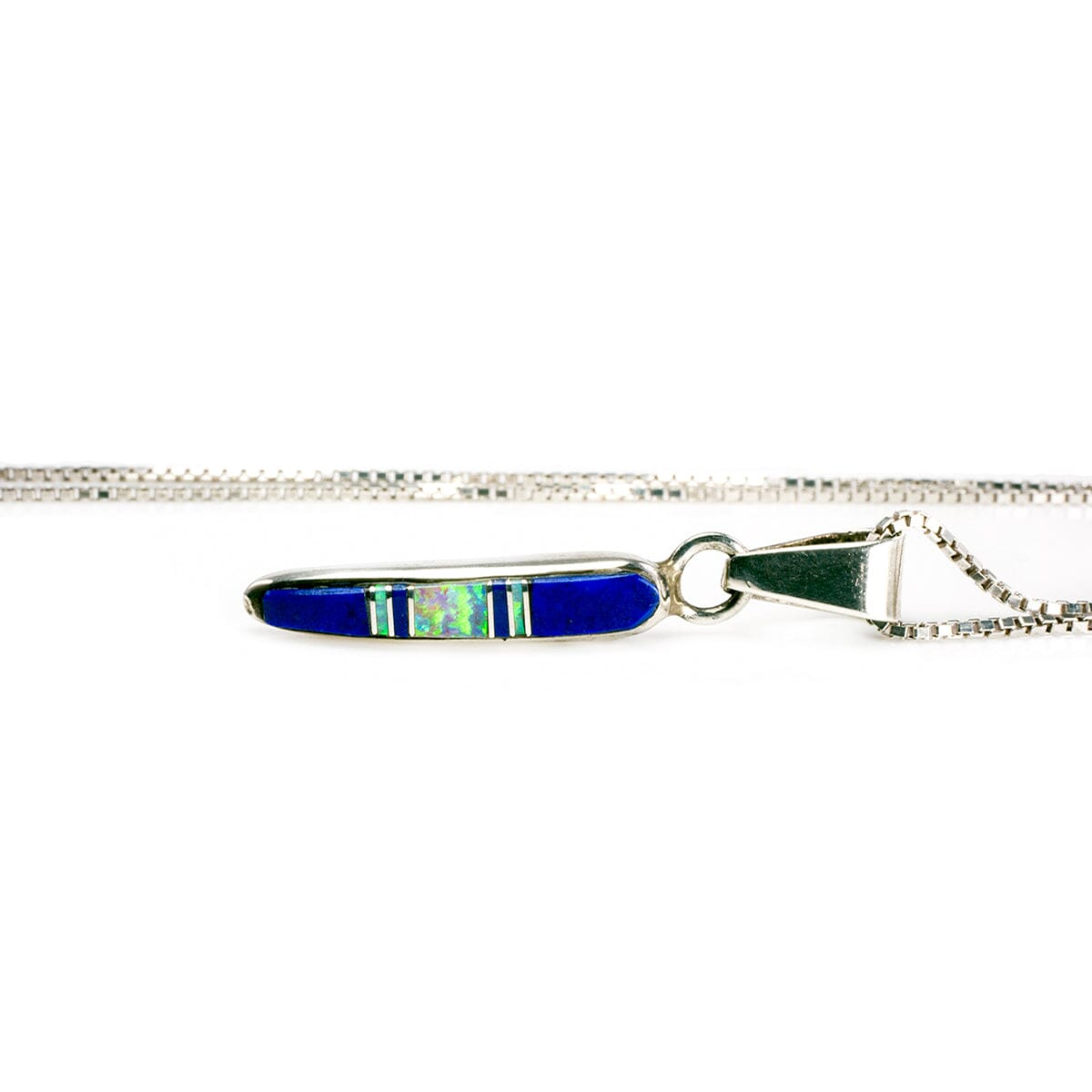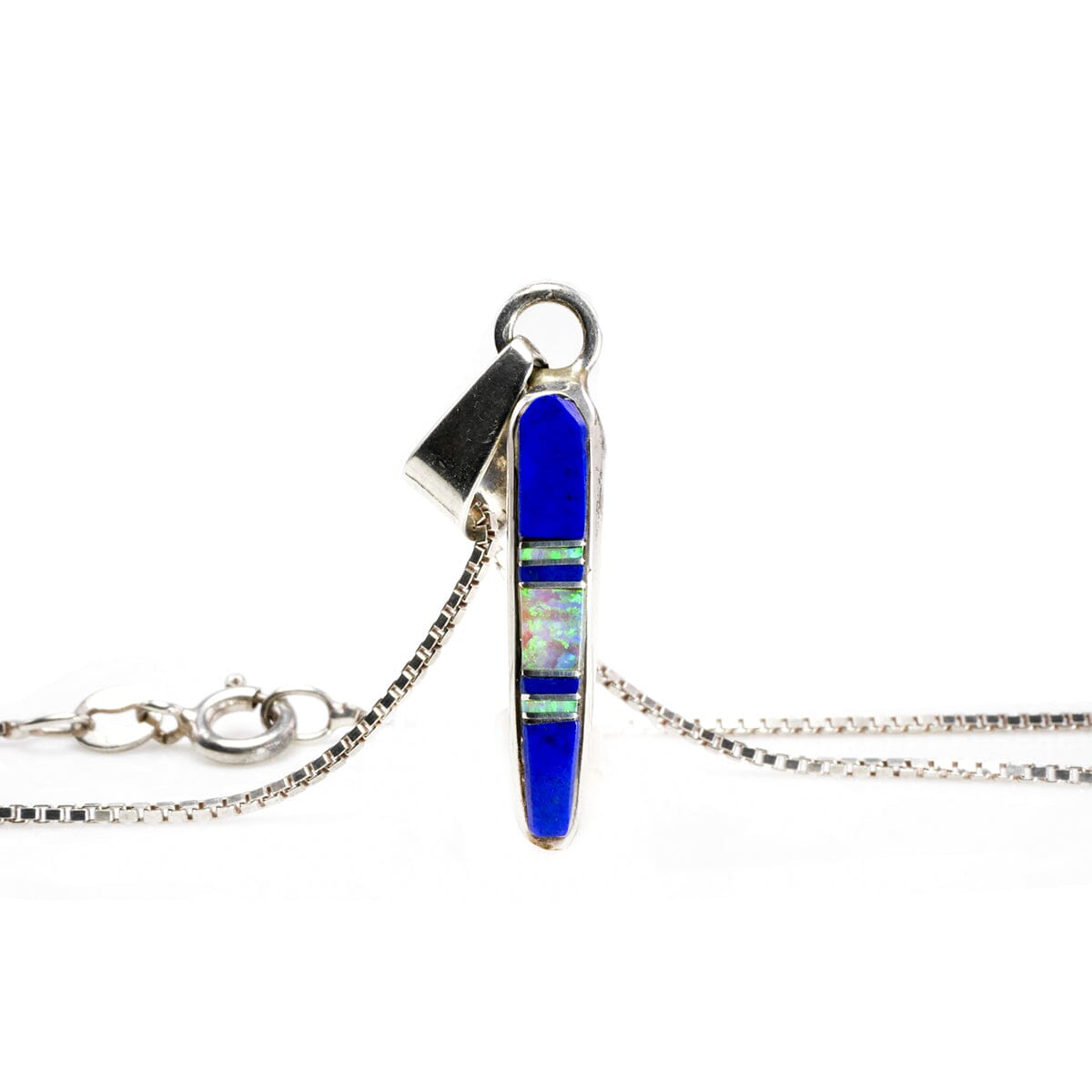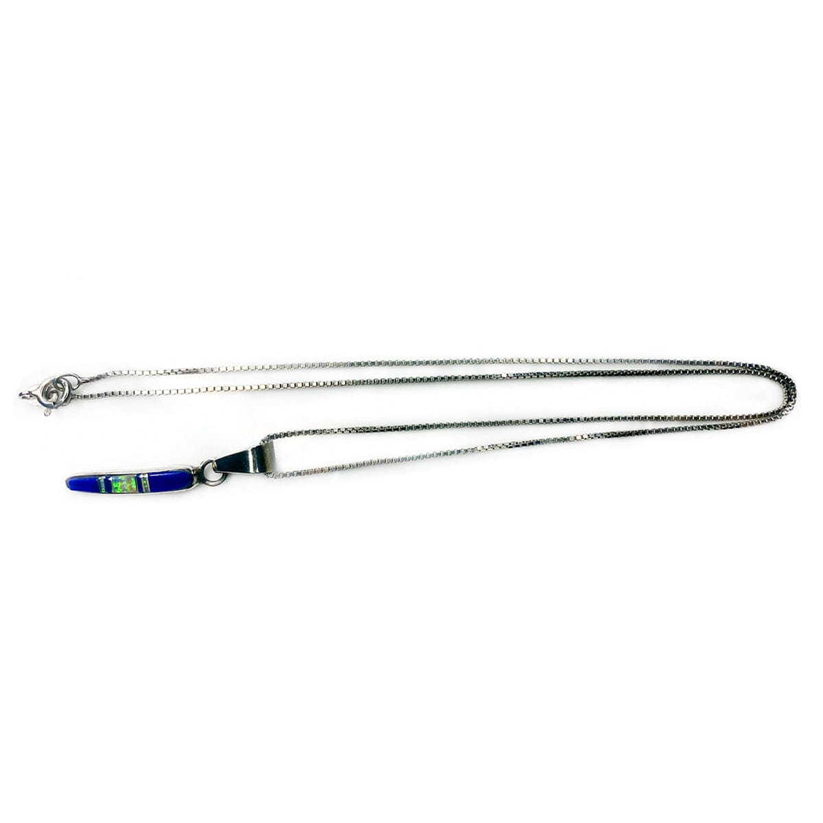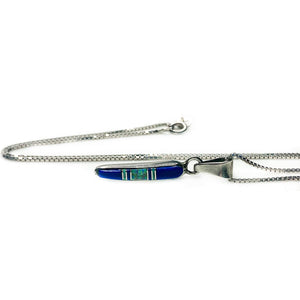 The pendant itself is an elongated design featuring inlay lapis and opal. This creates such a strong contrast between the cerulean shade of the lapis and the fluorescent green flecks that are characteristic of opal. The chain is fine with a lovely drape.