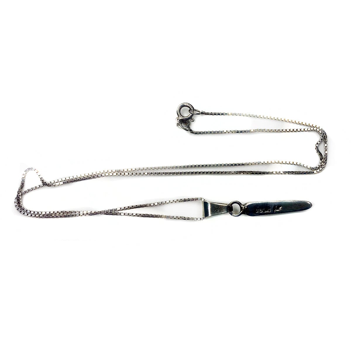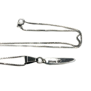 The necklace measures 18.5 inches which makes it one of the most popular chain lengths. The pendant measures 34 mm in length by 4.67 mm at the widest point towards the top. The necklace and pendant together weighs 4.4 grains.