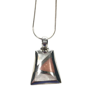 The pendant features inlay mother of pearl and what appears to be quartz, in a geometric pattern.