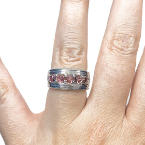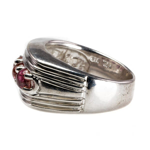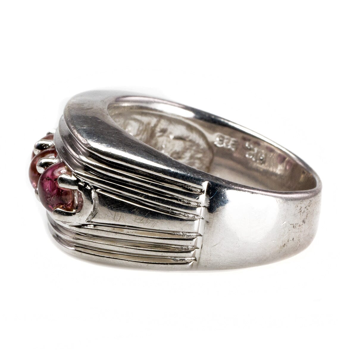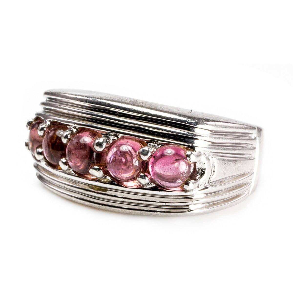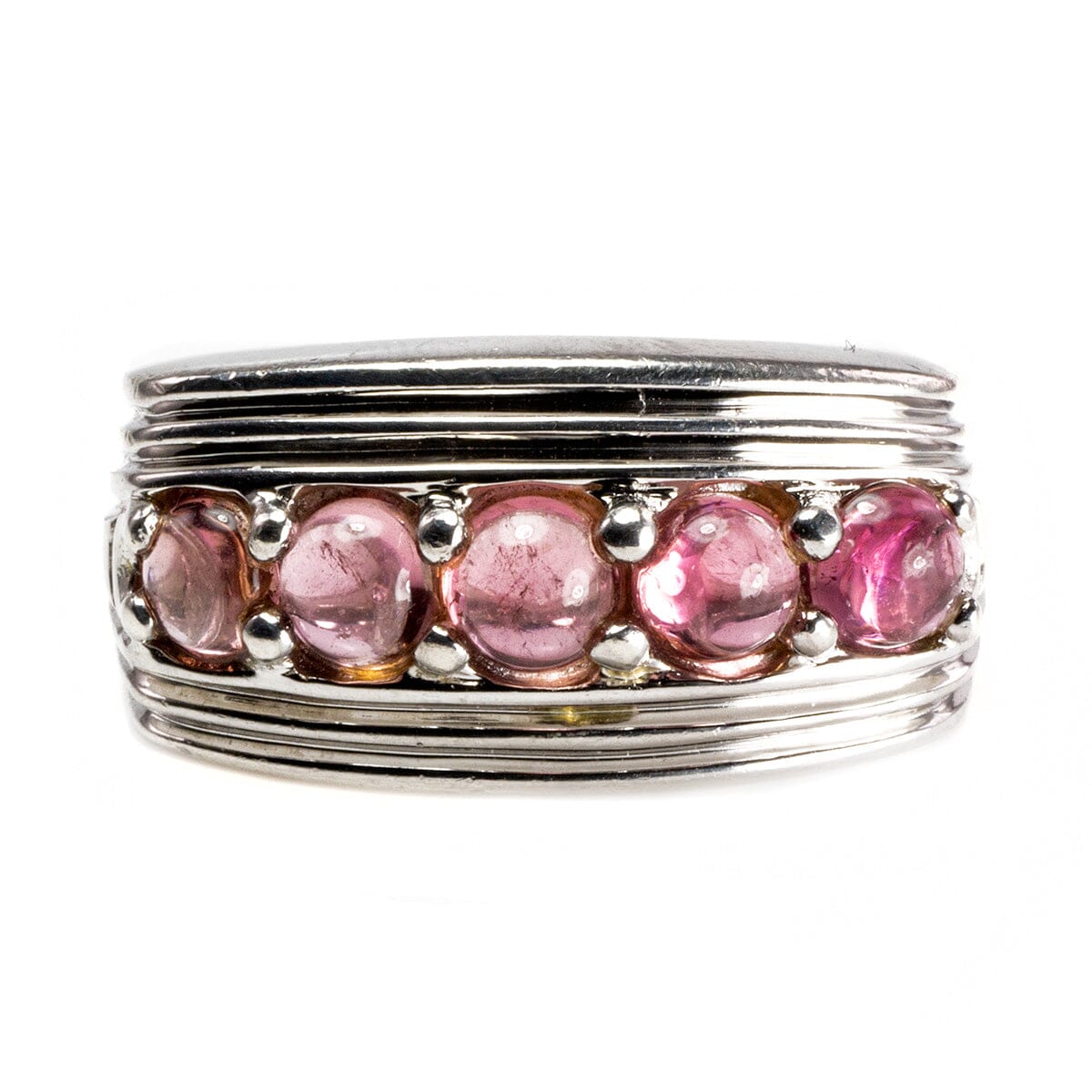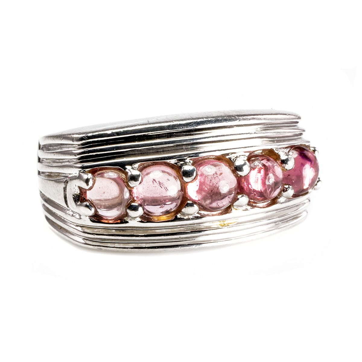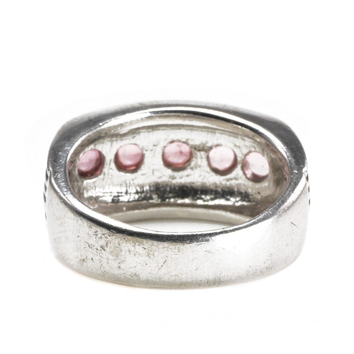 This Silver & Pink Cubic Zirconia Ring is quite unusual with a strong vintage vibe. It features a row of round, bubblegum pink cubic zirconia. These are framed on either side with ribbed silver.