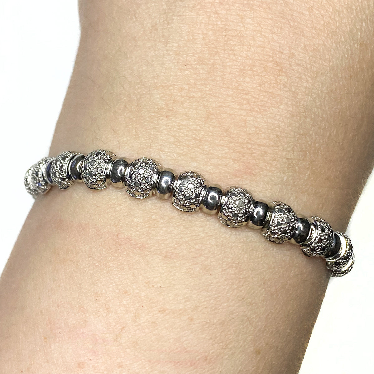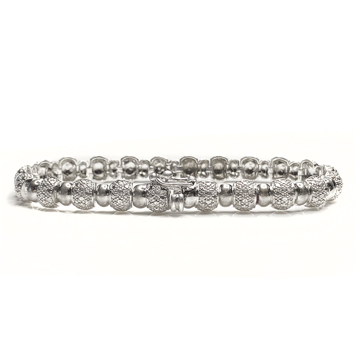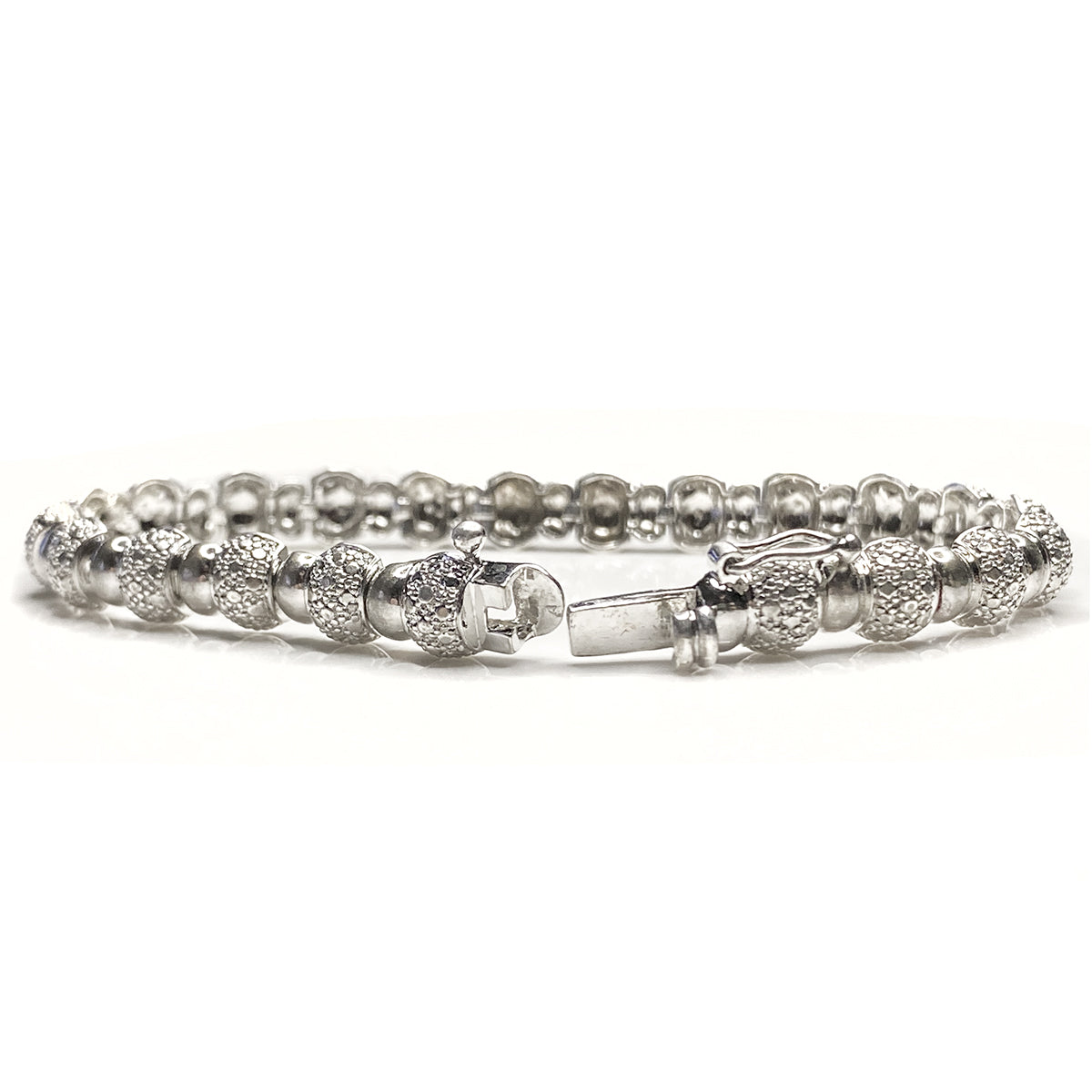 This Silver Plated Bracelet is a very attractive piece for everyday wear. It has a mix of high shine and textured silver stations that give the effect of a silver and diamond mix. It's very striking and a great substitute for a tennis bracelet at a fraction of the cost.