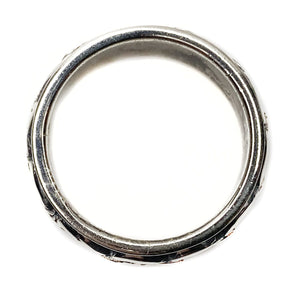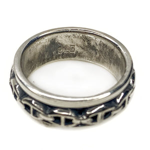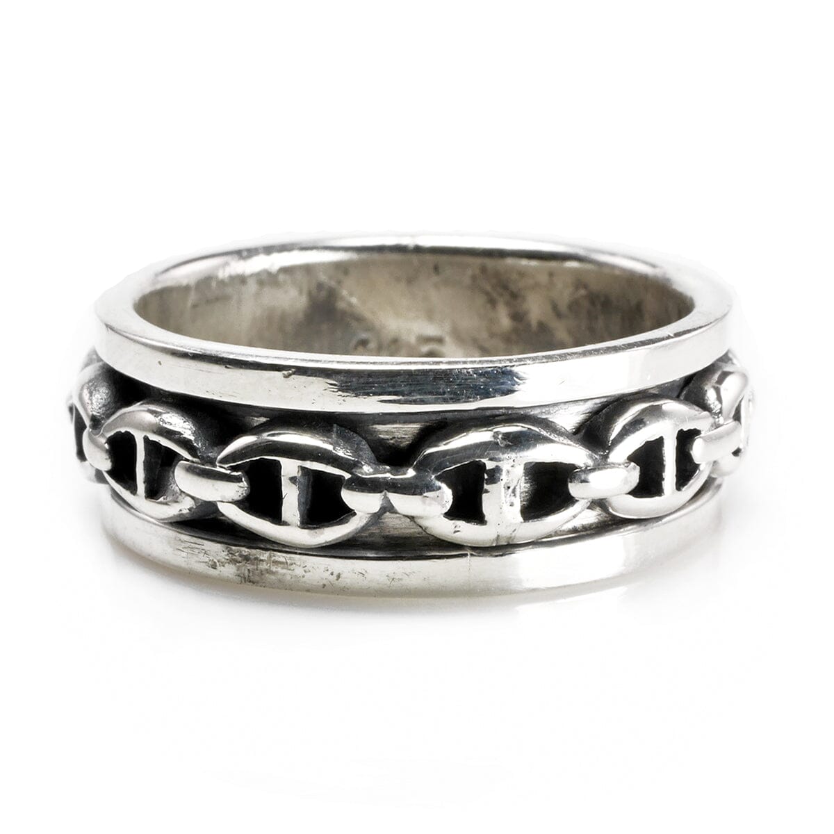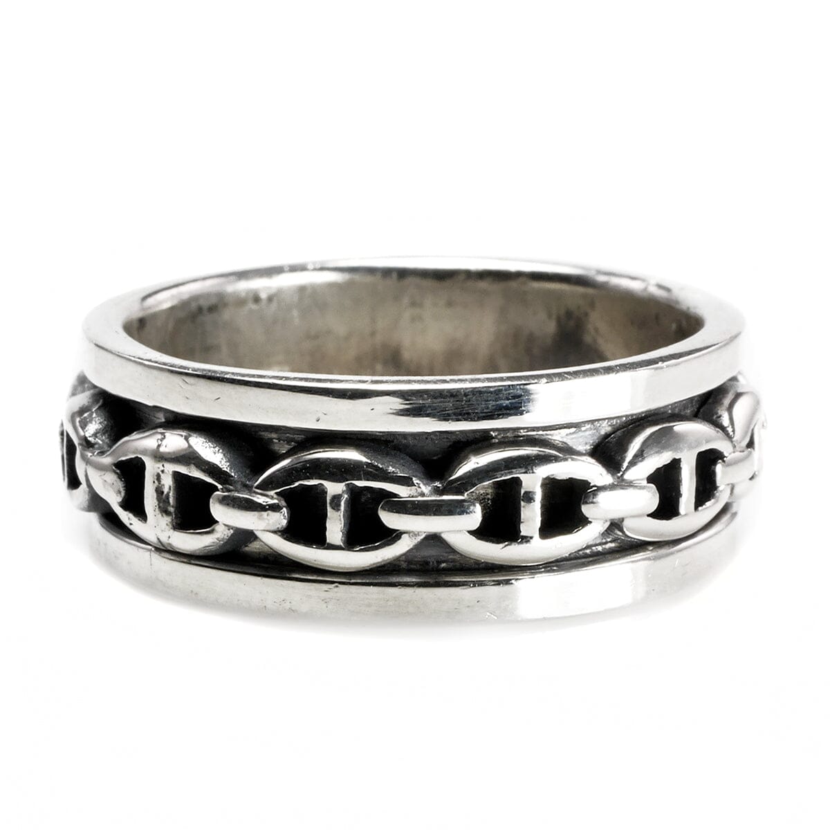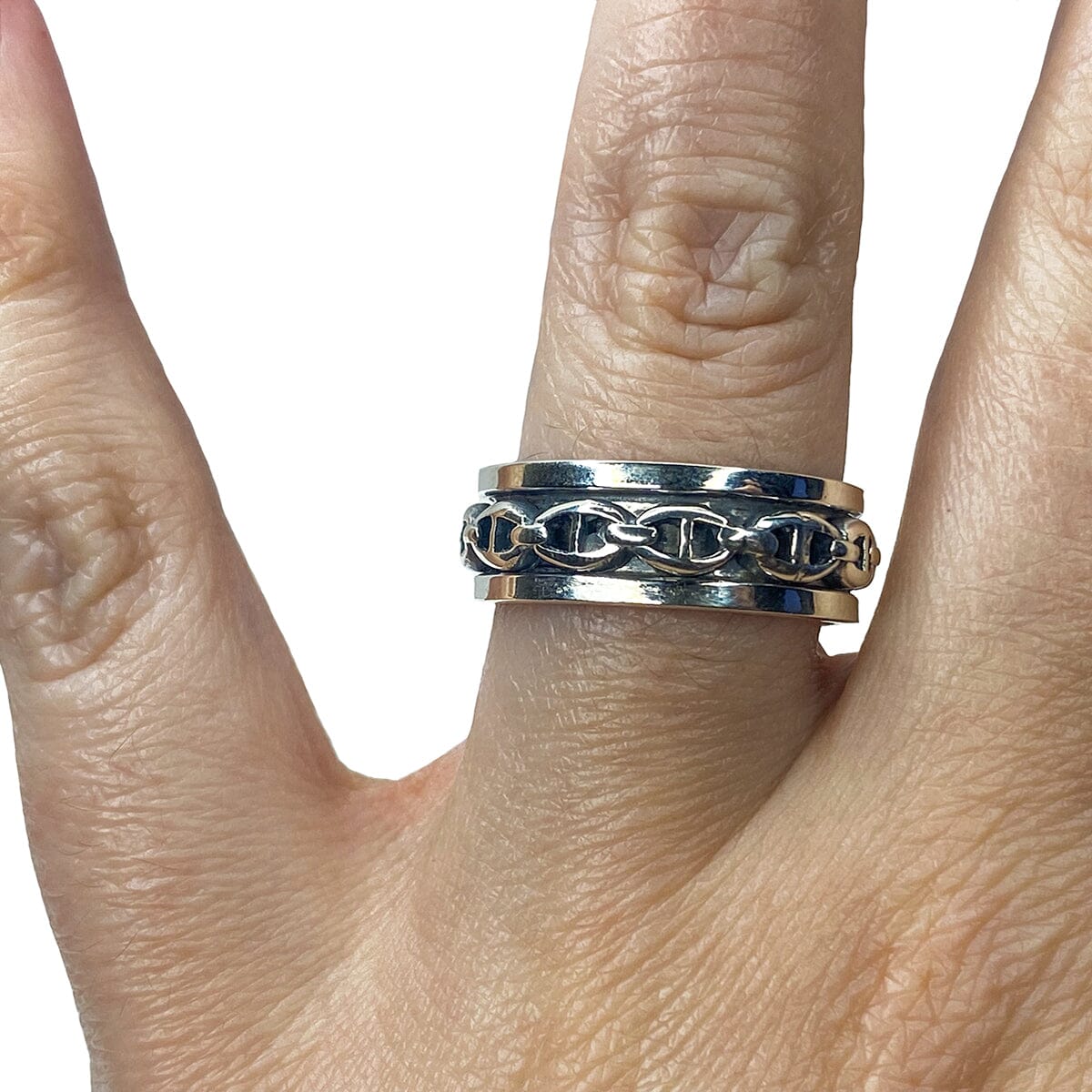 This Silver Spinner Ring features a mariner style chain running around the center of the ring. Spinner rings can help alleviate anxiety for some people. The center of the band rotates freely and the extra textured detail offers more grip for those who do wish to spin the ring. It's a wide, chunky ring and this also makes it an ideal thumb ring.