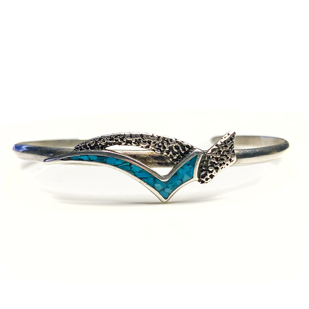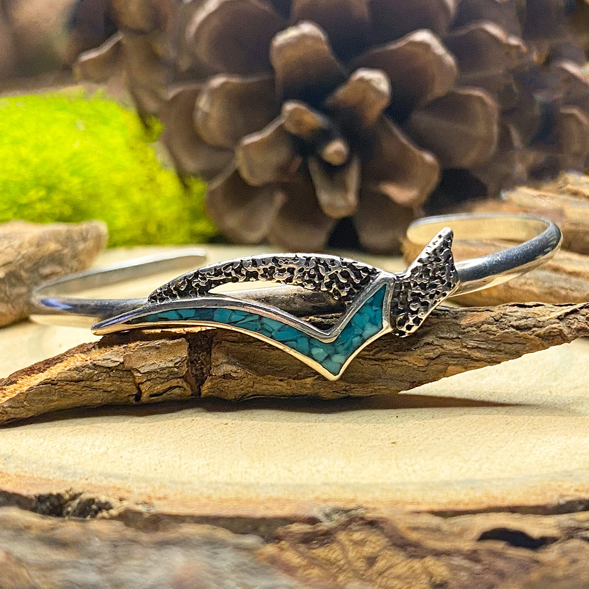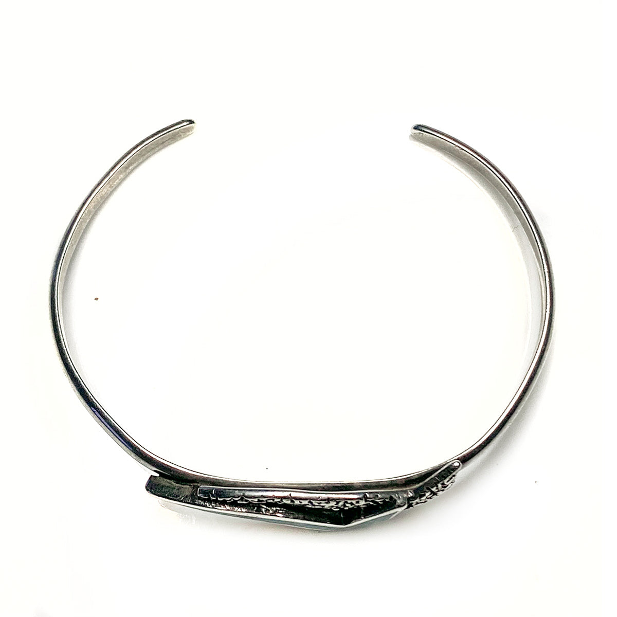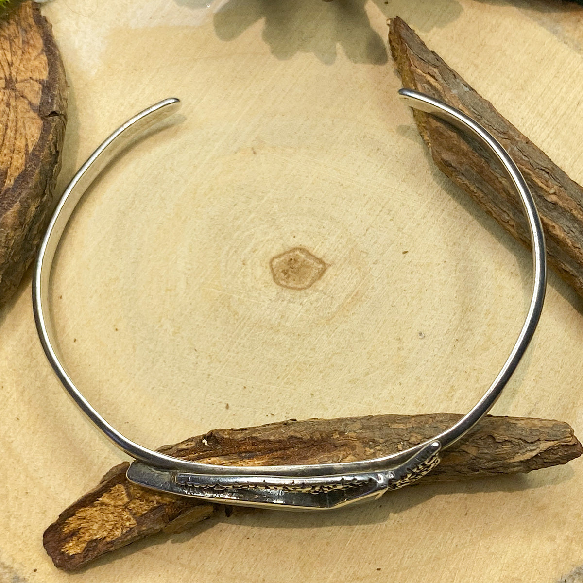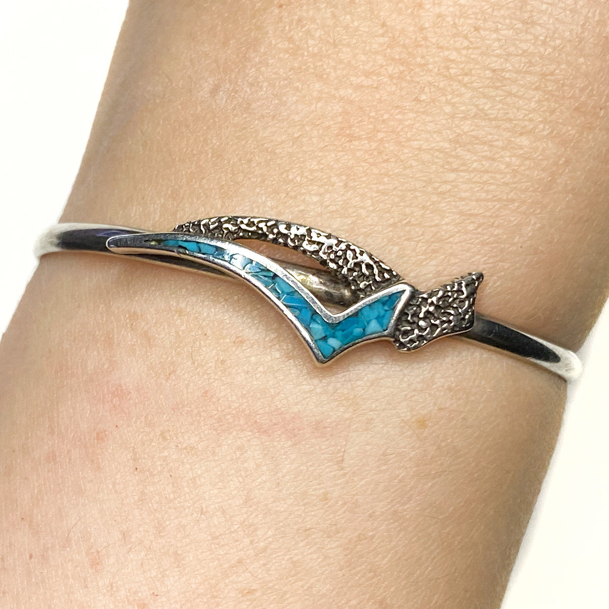 This Silver & Turquoise Bangle features a repeated abstract design, firstly in turquoise and then shadows in pitted, textured silver.