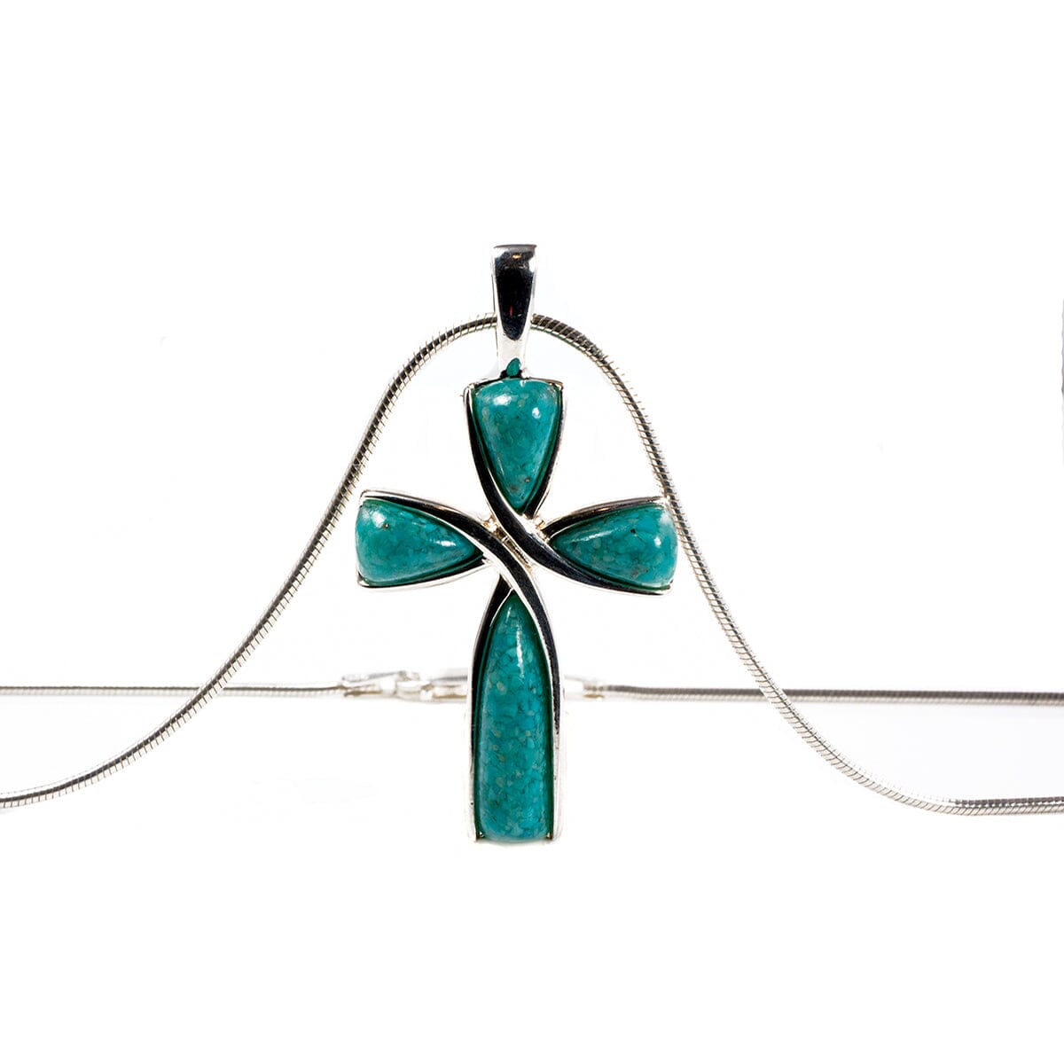 This Silver Turquoise Cross Necklace is ready to wear (or gift,) including both the cross pendant and the silver necklace. The cross itself is accented with four bright turquoise stones, each showing distinctive black crazing. The necklace is a fine snake chain, offering a bright high shine look with a lovely feminine drape.
