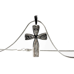 The cross pendant measures 36.3 mm in length and 19.5 mm in width. Meanwhile the necklace measures 18 inches in length and has a width of 1 mm. The pendant and chain together weigh 8.4 grams.