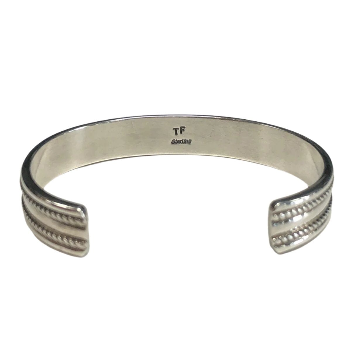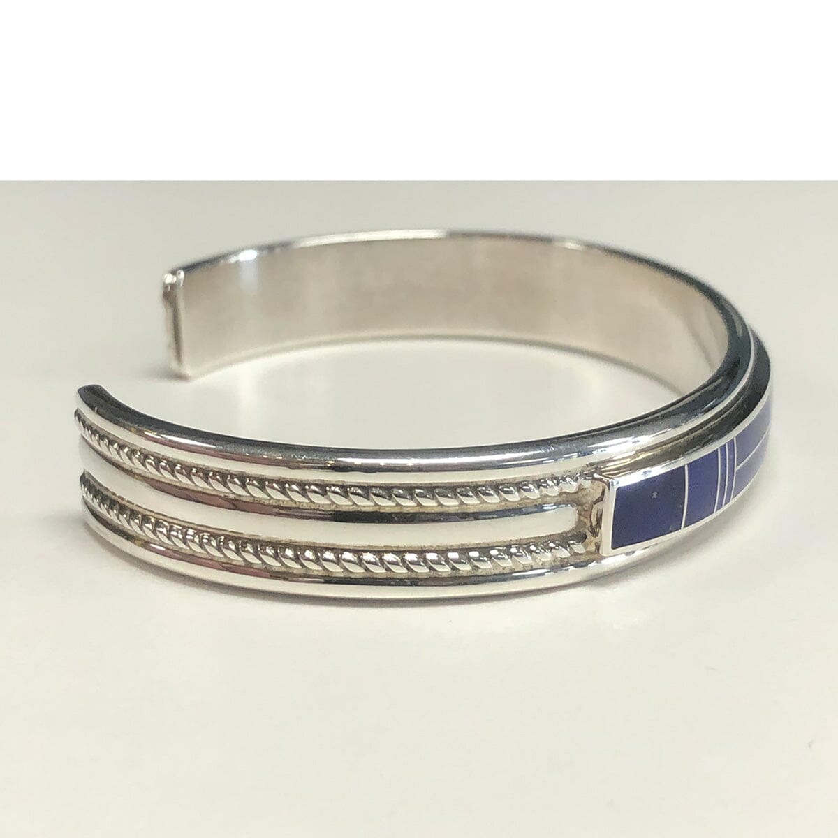 This Thomas Francisco Navajo Silver & Lapis Cuff Bangle is a beautiful example of the work of this Navajo artist. Though relatively simple in design, it shows meticulous attention to detail and a stunning level of inlaid stone work.