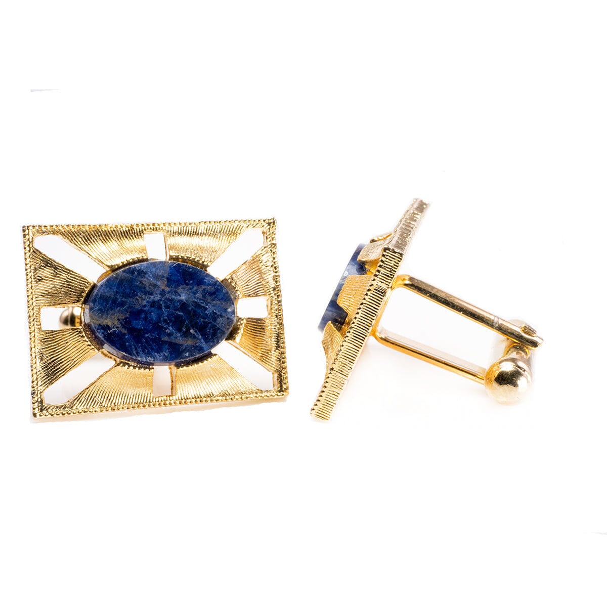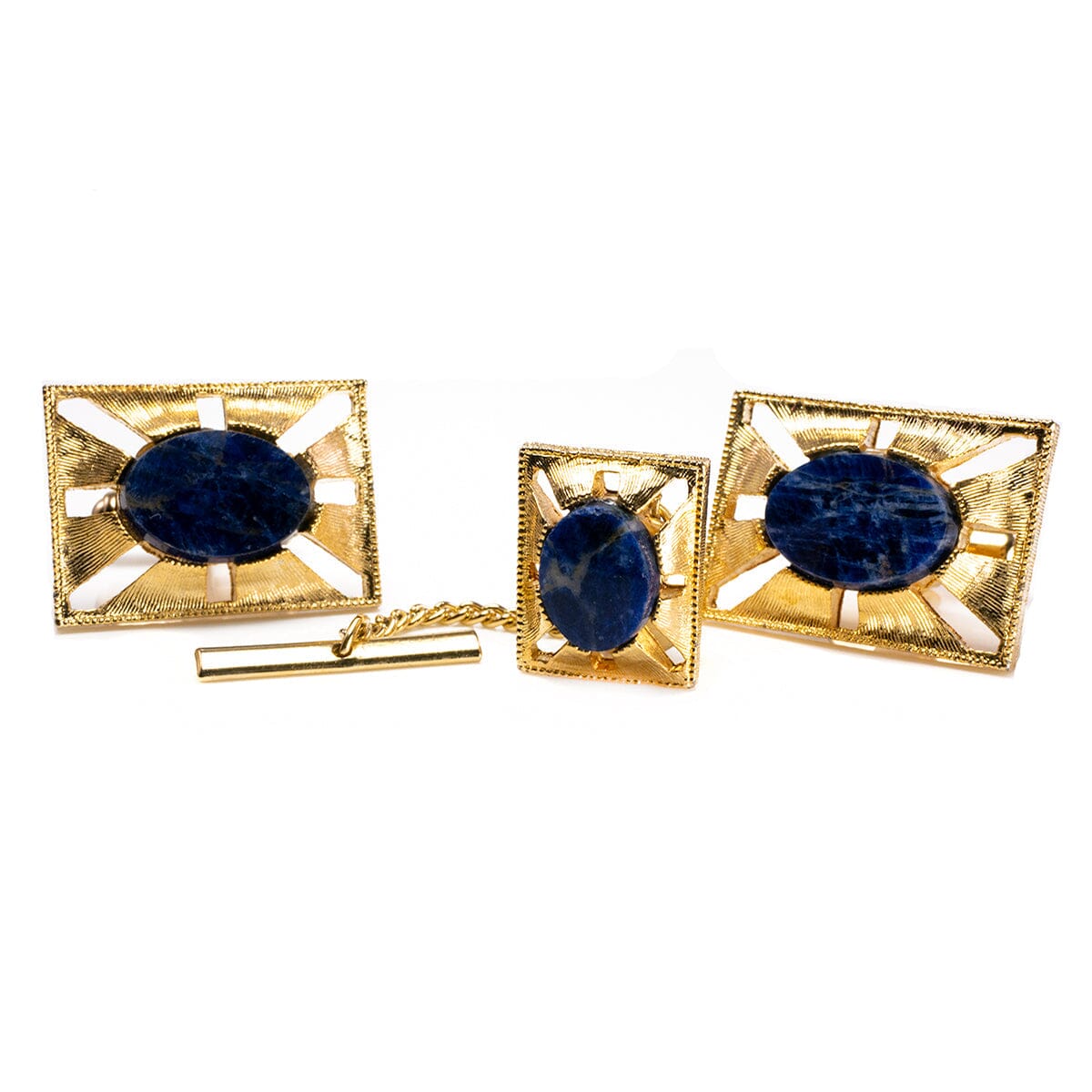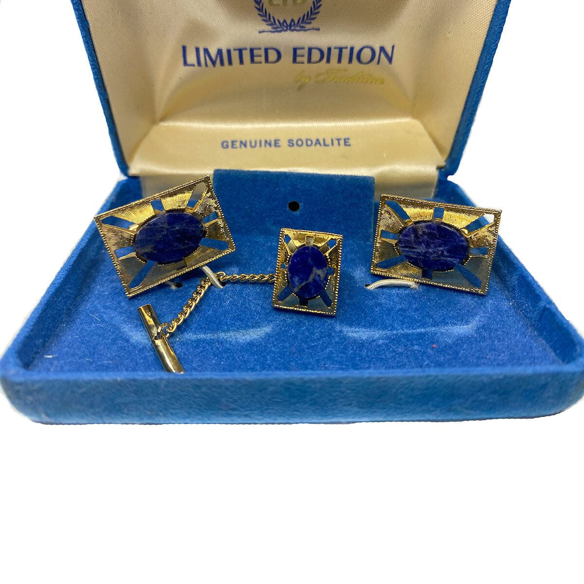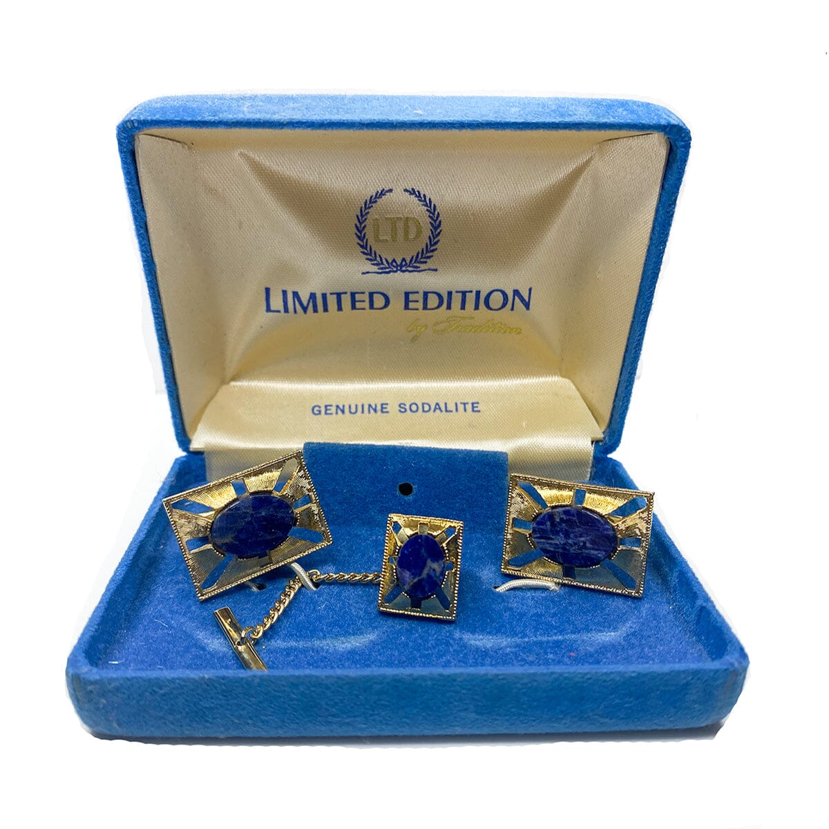 This Traditions Limited Edition Vintage Sodalite Cuff Link Set with Coordinating Pin has a beautiful gold and deep blue aesthetic. It's worth noting that these stones are not scratched or scuffed, sodalite as a stone does have white inclusions but of course is characterized by it's deep blue color. The design of this set is distinctly vintage.