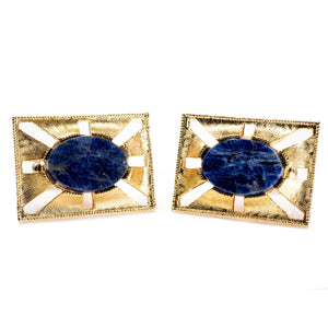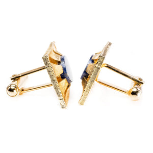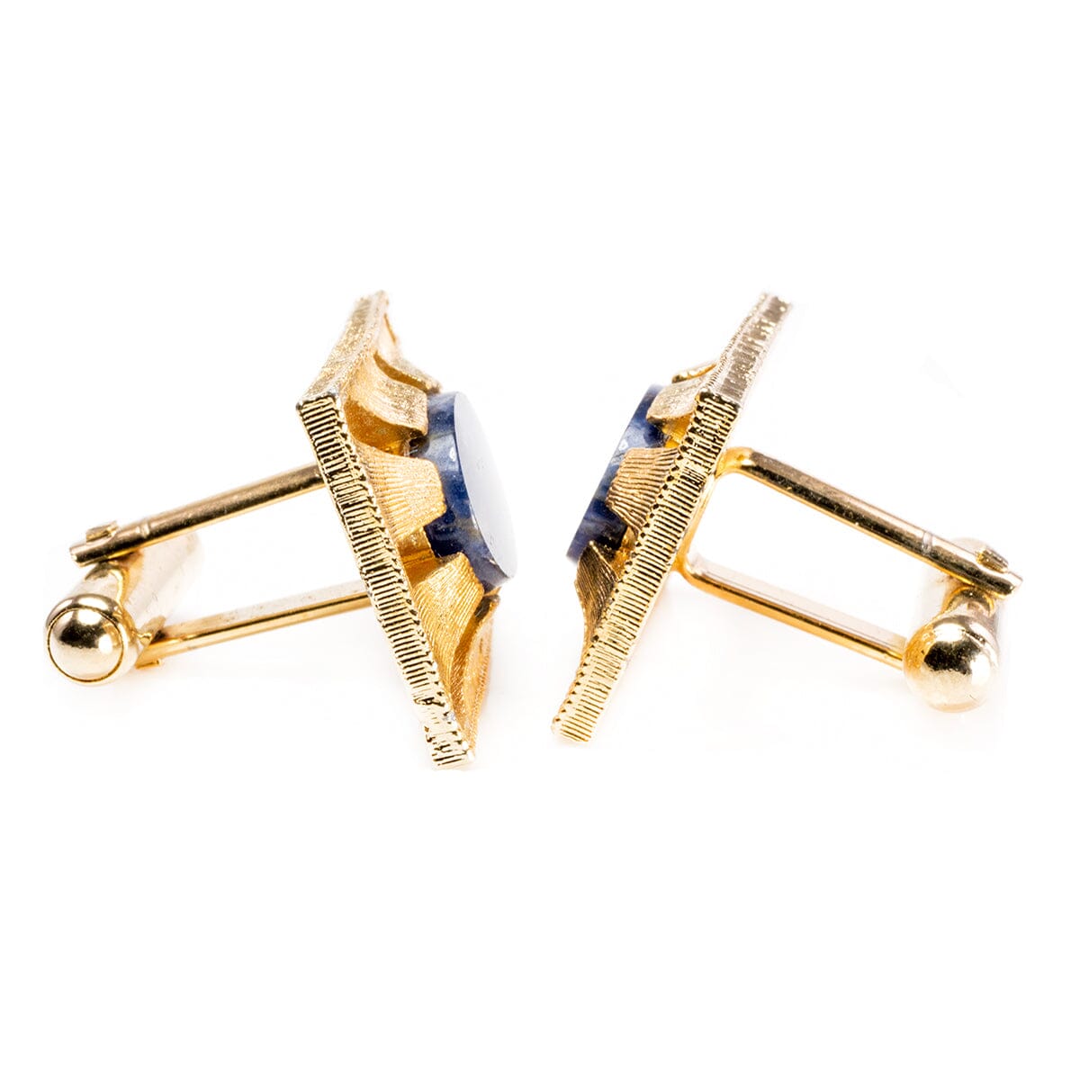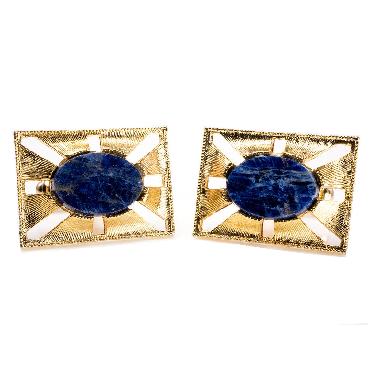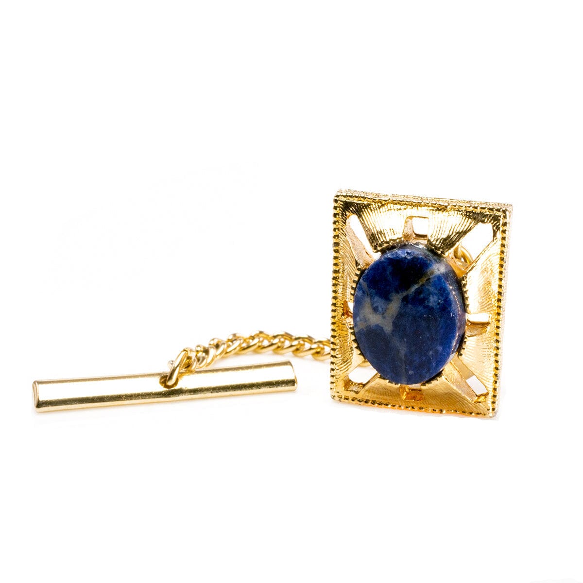 This Traditions Limited Edition Vintage Sodalite Cuff Link Set with Coordinating Pin has a beautiful gold and deep blue aesthetic. It's worth noting that these stones are not scratched or scuffed, sodalite as a stone does have white inclusions but of course is characterized by it's deep blue color. The design of this set is distinctly vintage.