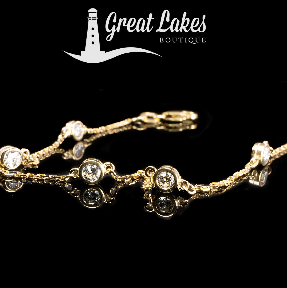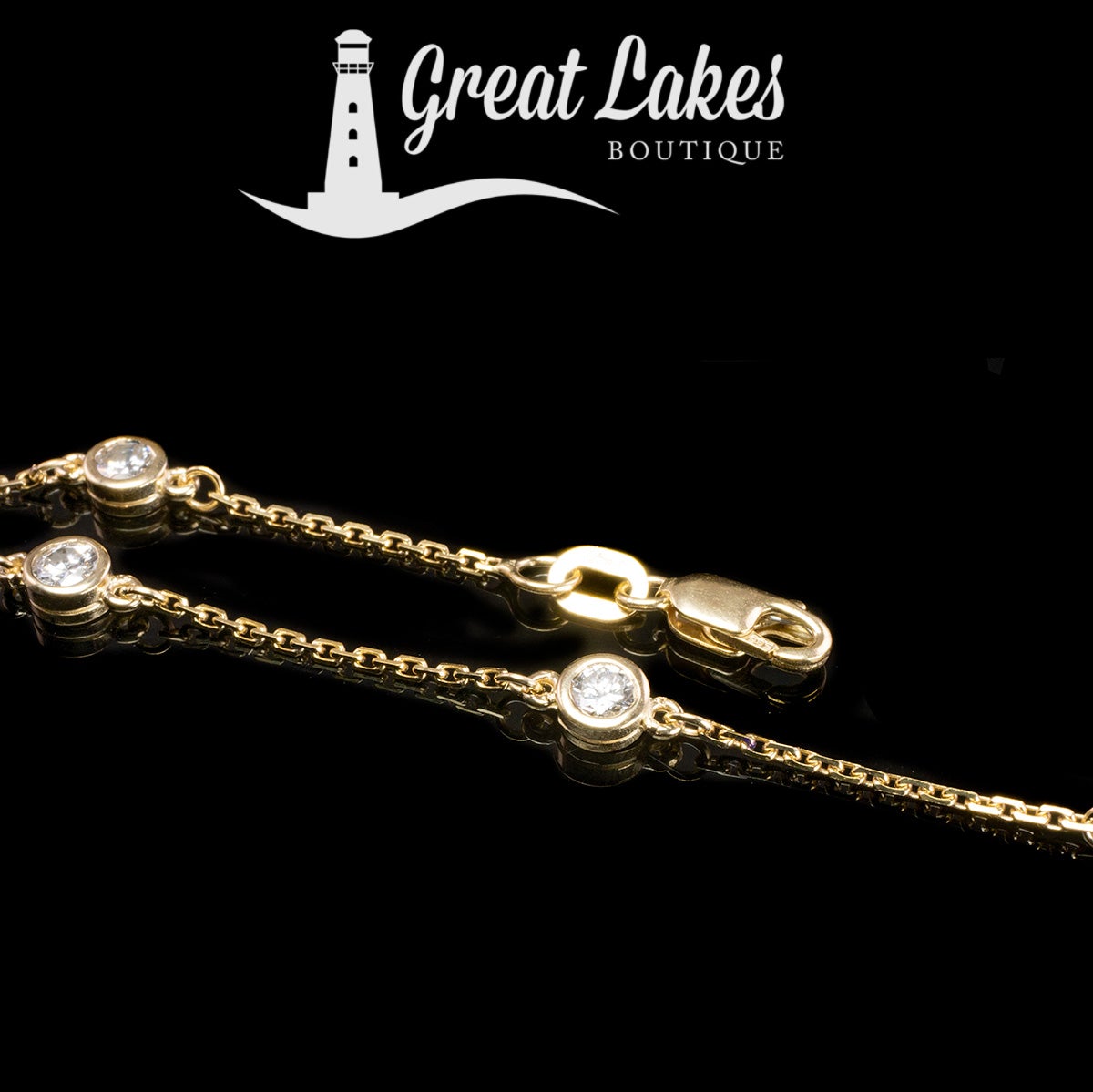 This fine yellow gold chain with bezel set diamonds is timeless and can be styled for either daily wear or an evening out. The chain is punctuated with five diamonds. Wear alone as an everyday luxurious essential or combine with a yellow gold bangle for extra sparkle. This chain with bezel accents complements our necklaces with the same settings. Layer pieces together for an on trend and dramatic look.